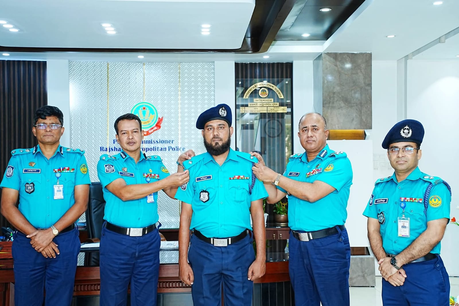 রাজশাহী মেট্রোপলিটন পুলিশের সদর দপ্তরে অনুষ্ঠিত এক অনাড়ম্বর অনুষ্ঠানে আরএমপির পুলিশ কমিশনার মোহাম্মদ আবু সুফিয়ান পদোন্নতিপ্রাপ্ত দুই কর্মকর্তাকে র্যাংক ব্যাজ পরিয়ে দেন।