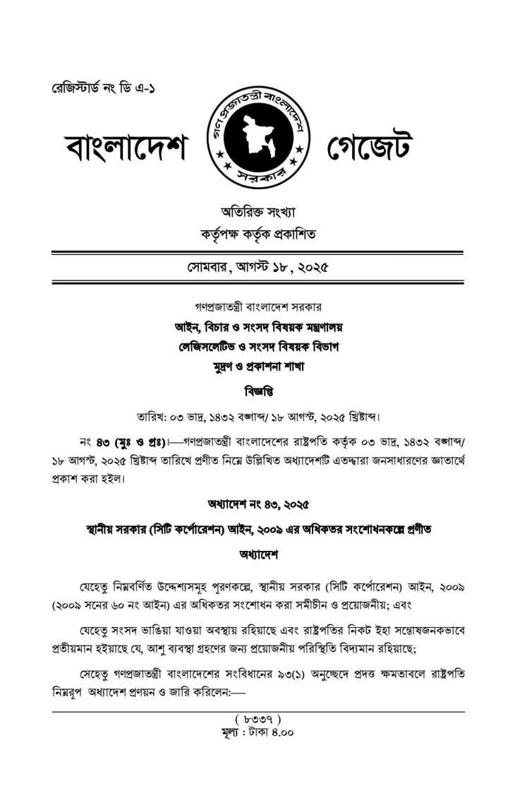 সম্প্রতি প্রকাশিত বাংলাদেশ গেজেটে স্থানীয় সরকার (সিটি কর্পোরেশন) আইন, ২০০৯ এর কয়েকটি ধারা ও উপধারা বাতিল করা হয়েছে। আইন বিশেষজ্ঞ ও নাগরিক সমাজ মনে করছেন, এই ধারাগুলো বাতিলের ফলে সিটি কর্পোরেশনের জবাবদিহিতা, স্বচ্ছতা এবং জনস্বার্থ রক্ষায় নেতিবাচক প্রভাব পড়তে পারে।