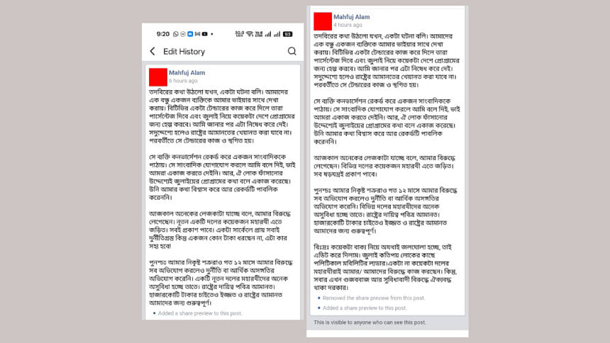 মাহফুজ আলমের পোস্ট ও সংশোধিত পোস্ট। ছবি: মাহফুজ আলমের ফেসবুক পোস্টের স্ক্রিনশট