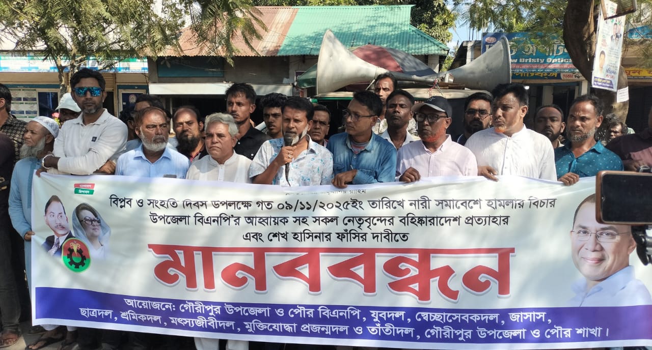 ময়মনসিংহের গৌরীপুরে জাতীয় বিপ্লব ও সংহতি দিবসের নারী সমাবেশে হামলার প্রতিবাদ, উপজেলা বিএনপির আহ্বায়ক আহাম্মদ তায়েবুর রহমান হিরণসহ ২৪ নেতাকে বহিষ্কারের সিদ্ধান্ত প্রত্যাহারসহ বিভিন্ন দাবিতে মানববন্ধন অনুষ্ঠিত হয়েছে।