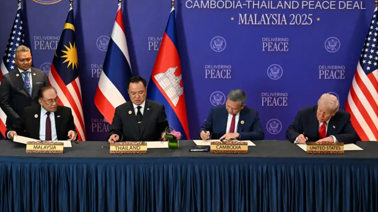 মার্কিন প্রেসিডেন্ট ডোনাল্ড ট্রাম্পের মধ্যস্থতায় শান্তি চুক্তি সই করেছে থাইল্যান্ড ও কম্বোডিয়া। রোববার মালয়েশিয়ায় আসিয়ান শীর্ষ সম্মেলনের ফাঁকে এই চুক্তিতে স্বাক্ষর করেন থাইল্যান্ডের প্রধানমন্ত্রী অনুতিন চার্নভিরাকুল ও কম্বোডিয়ার প্রধানমন্ত্রী হুন মানেত। এই চুক্তি স্বাক্ষর অনুষ্ঠানে সভাপতিত্ব করেন ট্রাম্প। খবর বিবিসির।