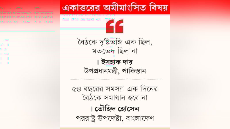 মুক্তিযুদ্ধের সময়ের বাংলাদেশ ও পাকিস্তানের মধ্যে অমীমাংসিত বিষয়গুলো দুবার সমাধান হয়েছে বলে দাবি করেছেন ঢাকা সফররত পাকিস্তানের উপপ্রধানমন্ত্রী ও পররাষ্ট্রমন্ত্রী ইসহাক দার। গতকাল রোববার ঢাকায় পররাষ্ট্র উপদেষ্টা তৌহিদ হোসেনের সঙ্গে দ্বিপক্ষীয় বৈঠকের পর সাংবাদিকদের মুখোমুখি হয়ে এ দাবি করেন তিনি। তবে এ দাবির সঙ্গে একমত নয় বাংলাদেশ। ঢাকা চায়, একাত্তরের গণহত্যার জন্য পাকিস্তান ক্ষমা প্রার্থনা করুক। অন্য দুটি অমীমাংসিত বিষয়েরও সমাধান করুক।