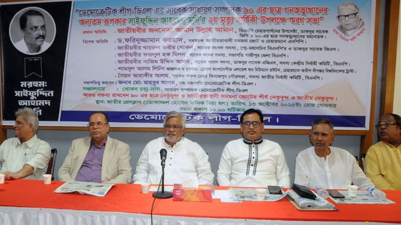 ডিএল-এর সহ-সভাপতি মো. মাহবুব আলমের সভাপতিত্বে স্মরণ সভায় আরো বক্তব্য দেন জাতীয়তাবাদী সমমাননা জোটের সমন্বয়ক ও ন্যাশনাল পিপলস পার্টির চেয়ারম্যান ড. ফরিদুজ্জামান ফরহাদ, শামসুল আলম লিটন, সৈয়দ জাহাঙ্গীর আলম প্রমুখ।