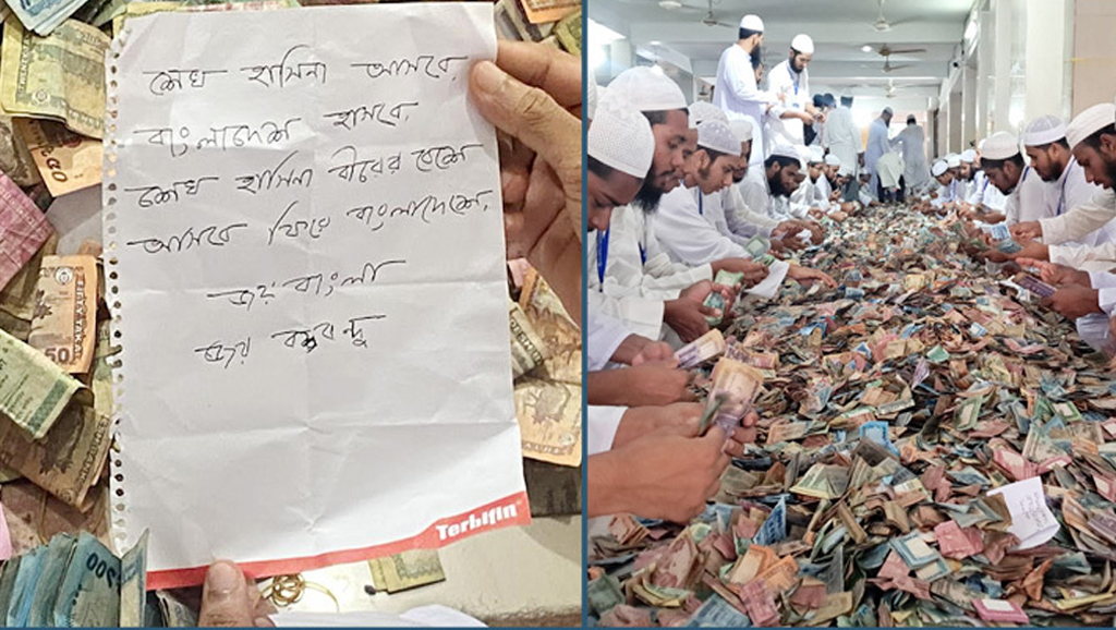 কিশোরগঞ্জ শহরের নরসুন্দা নদীর তীরে অবস্থিত ঐতিহাসিক পাগলা মসজিদের দানবাক্স খোলা হয়েছে আজ শনিবার (৩০ আগস্ট) সকালে। টানা ৪ মাস ১৮ দিন পর খোলা ১৪টি লোহার দানবাক্স থেকে এবার মিলেছে ৩২ বস্তা টাকা। এবার কিশোরগঞ্জের পাগলা মসজিদের দানবক্সে টাকার সাথে পাওয়া গেলো একটি চিরকুট। যে চিরকুটে লেখা রয়েছে, শেখ হাসিনা আসবে বাংলাদেশ হাসবে।
