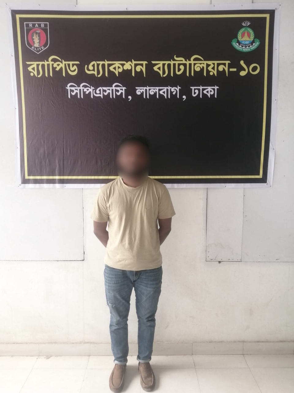 র্যাব-১০ এর একটি আভিযানিক দল গোপন সংবাদের ভিত্তিতে এবং আধুনিক তথ্যপ্রযুক্তির সহায়তায় গতকাল ২৮ জুলাই ২০২৫, বিকাল আনুমানিক ৪টায় কামরাঙ্গীরচর থানাধীন লোহার ব্রিজ এলাকায় অভিযান পরিচালনা করে তাকে আটক করে।
