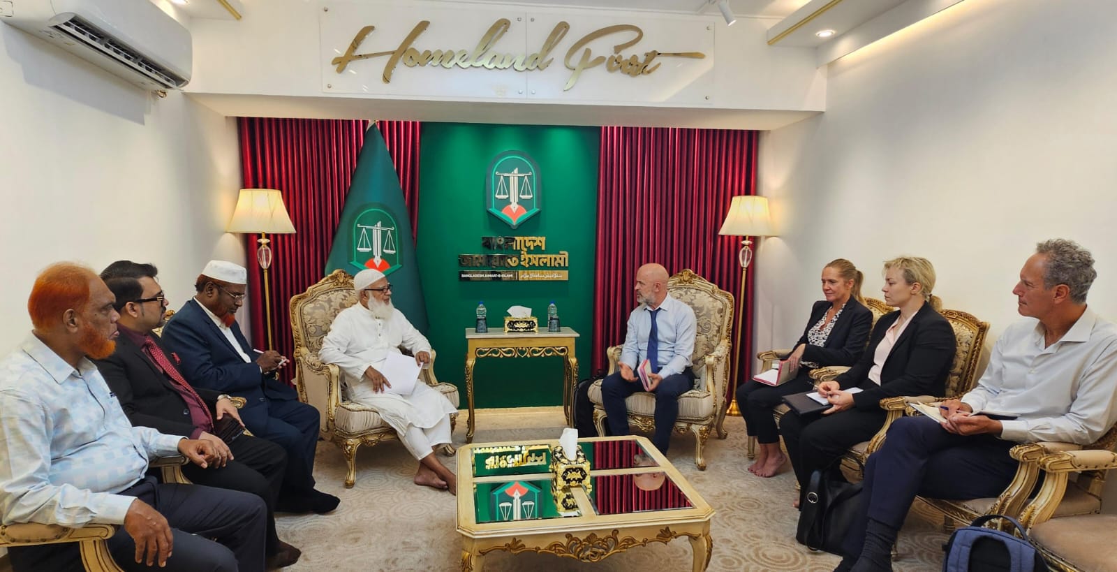জামায়াত আমিরের বসুন্ধরার কার্যালয়ে আজ রোববার (২৮ সেপ্টেম্বর) সকালে ঢাকায় নিযুক্ত স্পেনের রাষ্ট্রদূত এবং দুপুরে ইউরোপীয় ইউনিয়নের ইলেকশন অবজারভেশন মিশনের একটি প্রতিনিধি দলের সঙ্গে বৈঠক করেন জামায়াত নেতারা। দুটি বৈঠকেই জামায়াতের পুরোনো লোগোর জায়গায় নতুন লোগো দেখা গেছে।