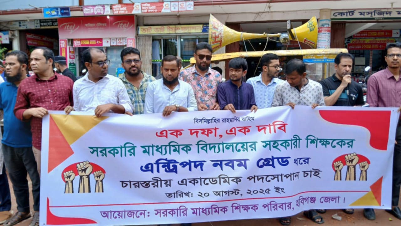 হবিগঞ্জে সরকারি মাধ্যমিক বিদ্যালয়ের সহকারী শিক্ষকদের নবম গ্রেডে এন্ট্রি পদ ও চার স্তরের একাডেমিক পদসোপানের দাবিতে মানববন্ধন করেছেন জেলার শিক্ষকরা।