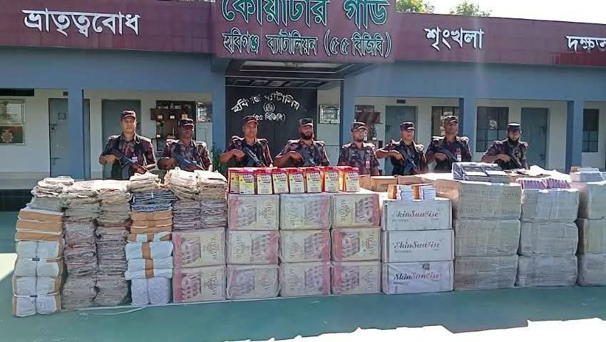 হবিগঞ্জে পাথরের নিচে লুকিয়ে পাচারের সময় প্রায় সাড়ে তিন কোটি টাকার ভারতীয় চোরাচালান পণ্য জব্দ করেছে বর্ডার গার্ড বাংলাদেশ (বিজিবি)–এর হবিগঞ্জ ব্যাটালিয়ন (৫৫ বিজিবি)।