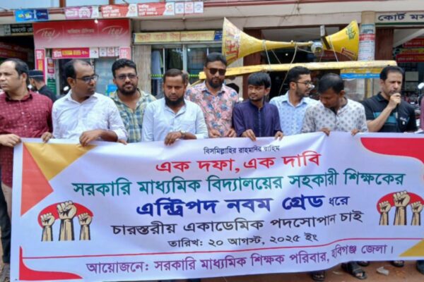 হবিগঞ্জে সরকারি মাধ্যমিক শিক্ষকদের মানববন্ধন, নবম গ্রেডে এন্ট্রি পদ ও চার স্তরের একাডেমিক কাঠামোর দাবি